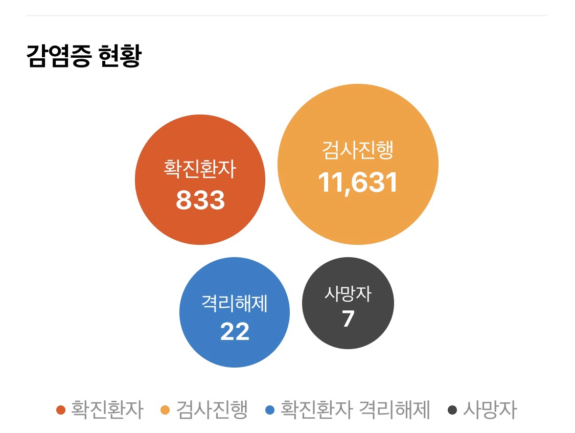 현재시각으로 833명이 확진 되었고,