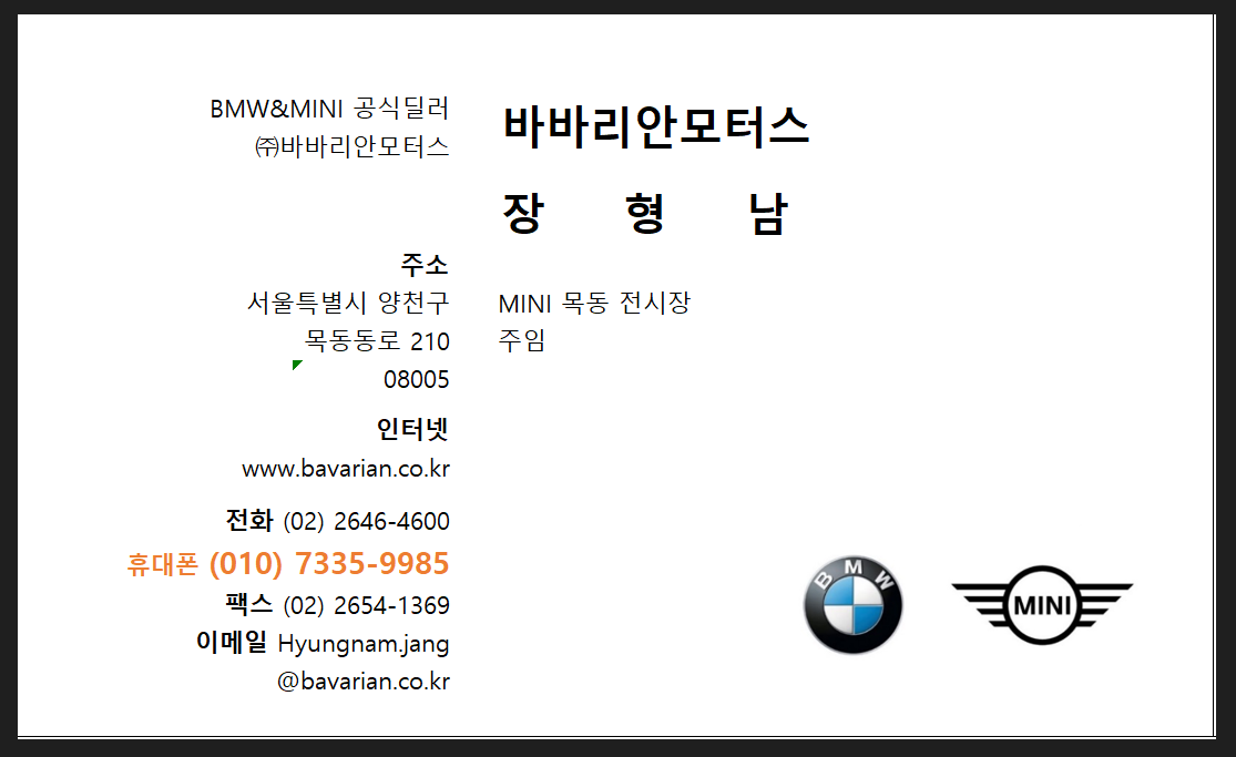안녕하세요. 미니 목동전시장 장형남 주임입니다. 미니에 관한 모든것들 상담드리도록 하겠습니다. 편하게 문의주세요 !! #미니쿠퍼, #목동미니