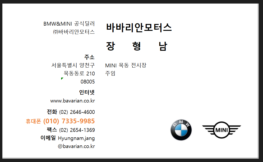 안녕하세요. 미니 목동전시장 장형남 주임입니다. 미니에 관한 모든것들 상담드리도록 하겠습니다. 편하게 문의주세요 !! #미니쿠퍼, #목동미니