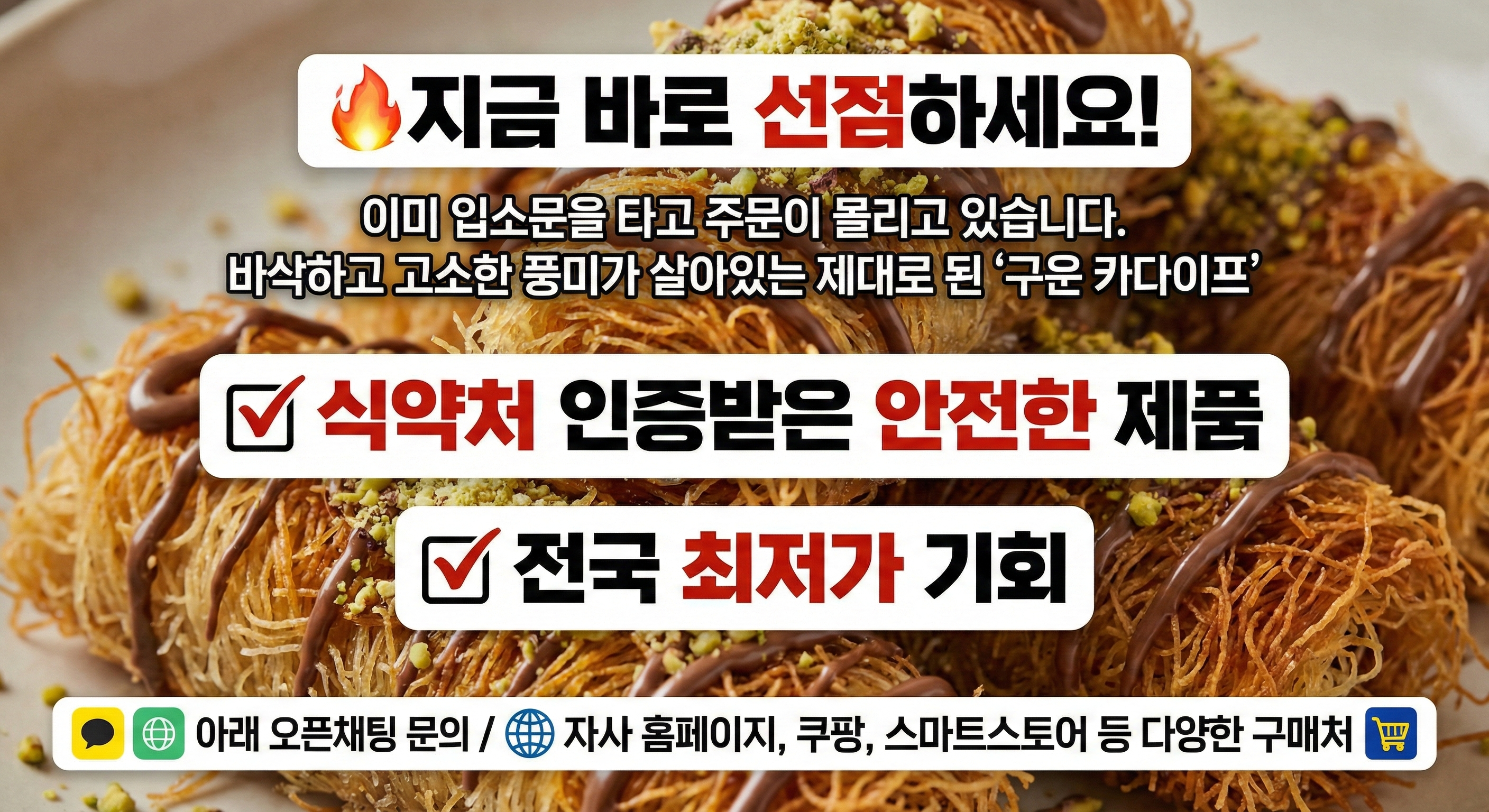 카다이프 유통이 필요한 식자재 업체, 프랜차이즈 본사, 대량 구매처가 있다면 언제든 연락 주세요.